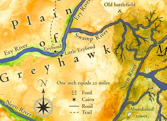 After this mornings breakfast (Jaron even cooked biscuits!), the company continued to ride on to the east, crossing only one well-used path, which Gimar said was from the Cairn Hills militia, patrolling the edge of the marsh. Still, Gimar seemed the experienced adventurer, and also appeared to have a good handle on that map he was staring at...